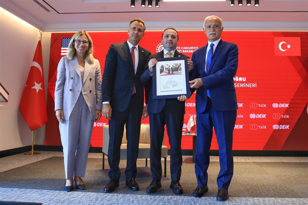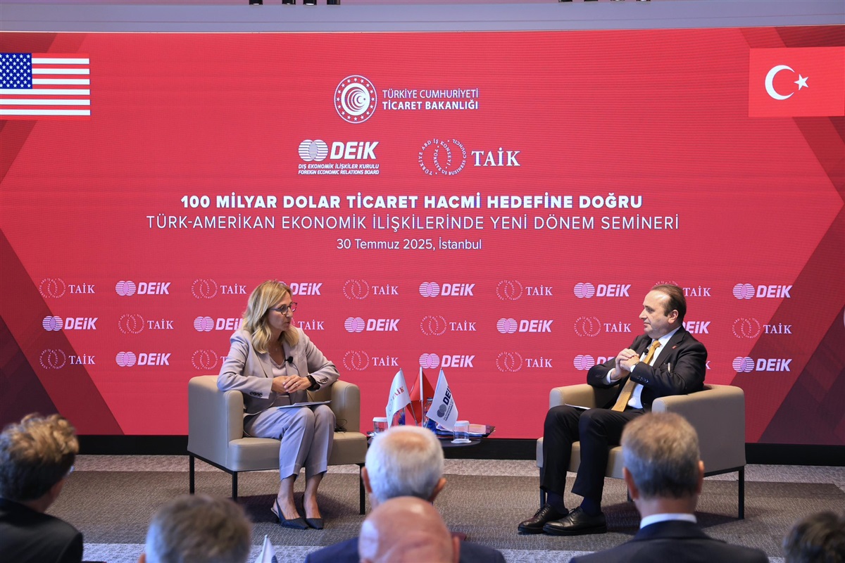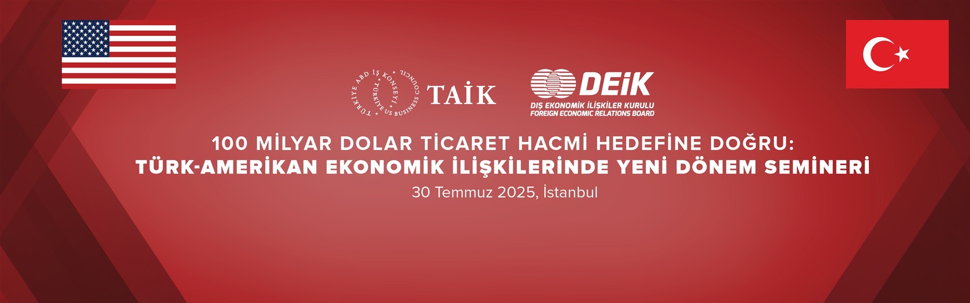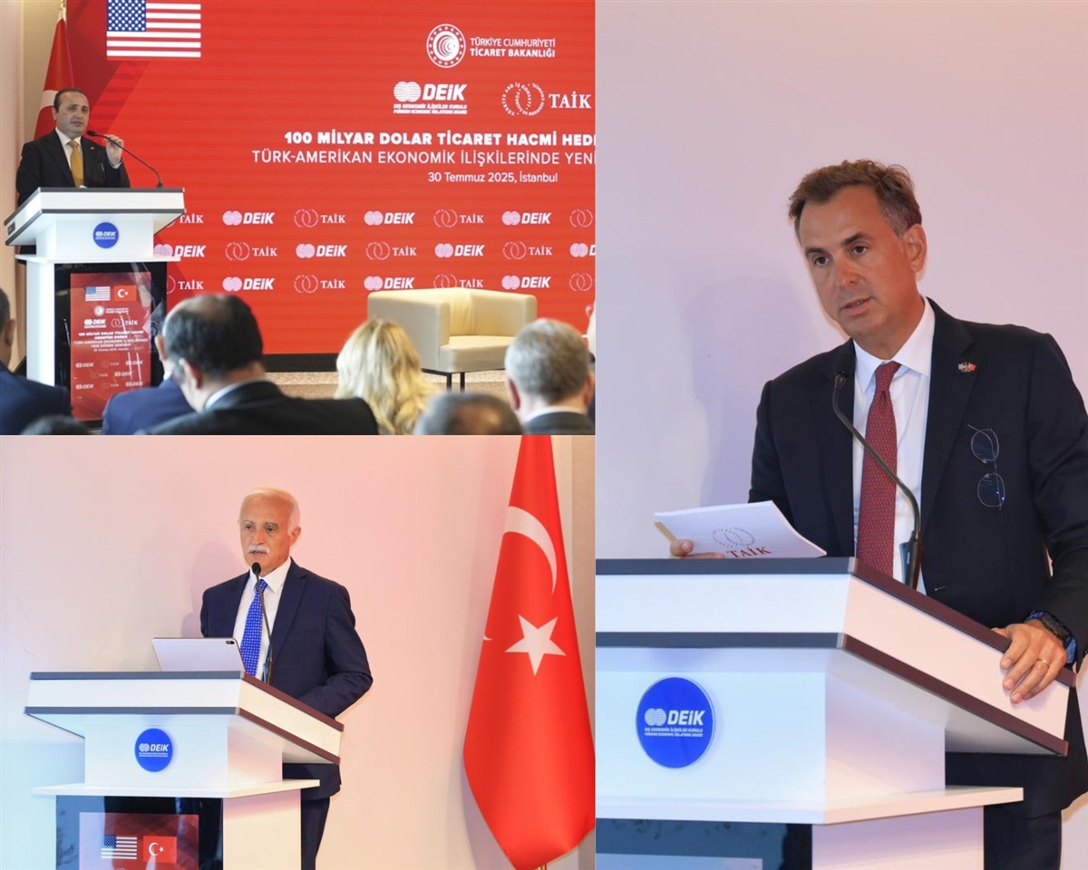 DEİK/Türkiye-ABD İş Konseyi (TAİK), “100 Milyar Dolar Ticaret Hacmi Hedefine Doğru: Türk-Amerikan Ekonomik İlişkilerinde Yeni Dönem” semineri kapsamında Türk iş dünyasını 30 Temmuz 2025 tarihinde İstanbul’da bir araya getirdi. Dış Ekonomik İlişkiler Kurulu (DEİK)/Türkiye-ABD İş Konseyi ev sahipliğinde T.C. Ticaret Bakan Yardımcısı Mustafa Tuzcu, DEİK Başkanı Nail Olpak, DEİK/Türkiye-ABD İş Konseyi (TAİK) Başkanı Murat Özyeğin, DEİK Yönetim Kurulu Üyesi Ebru Özdemir ve TAİK üyelerinin katılımıyla gerçekleştirilen etkinlikte, iki ülke arasındaki ekonomik ilişkilerin geleceği ve Türk iş dünyasının ABD ile ticaretteki yol haritası ele alındı.